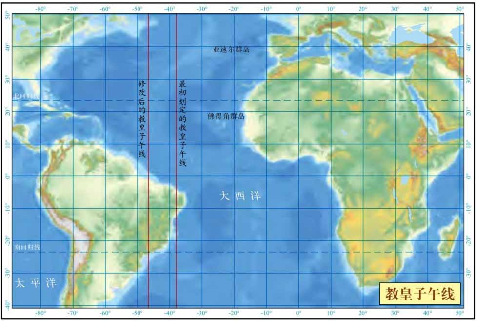 1493 年,教宗像切西瓜似的,把地球一分为二。分界线是位于非洲西海岸佛得角群岛以西 100 里格的那条经线,里格是当时绘制地图的度量单位。这条线以西的未知土地都归西班牙,以东的未知土地都归葡萄牙。