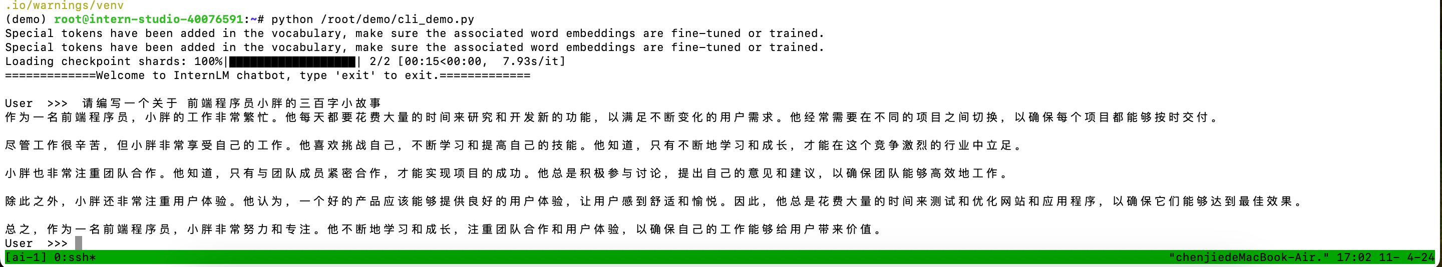 • 使用 InternLM2-Chat-1.8B 模型生成 300 字的小故事(需截图)