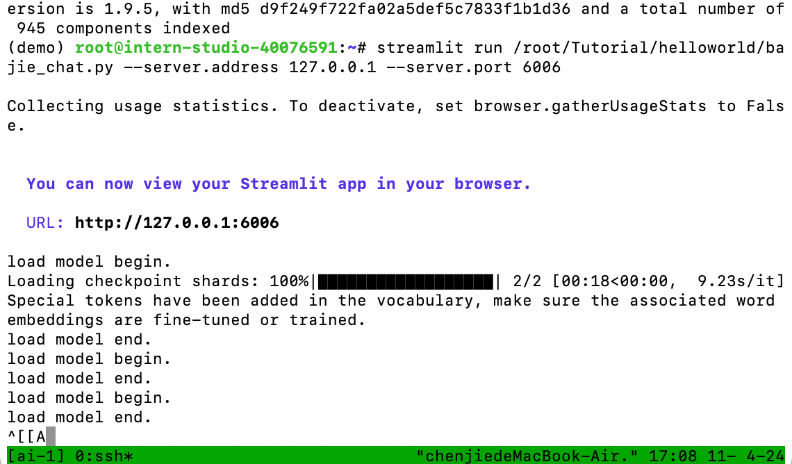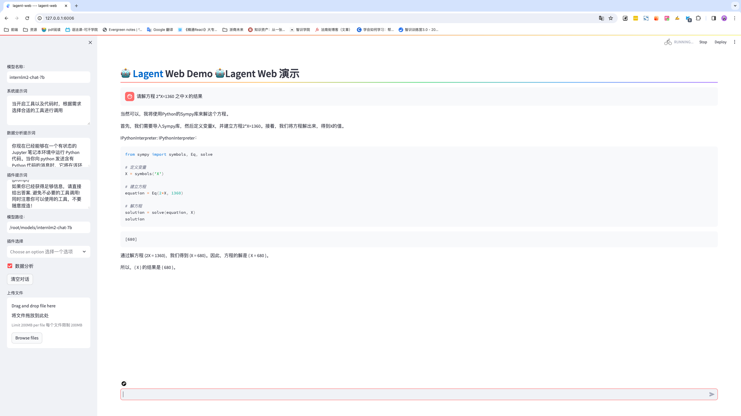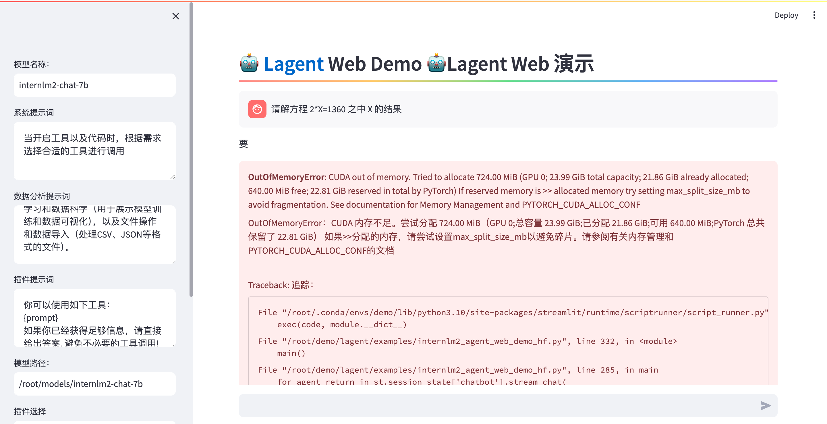 • 完成 Lagent 工具调用 数据分析 Demo 部署(需截图)