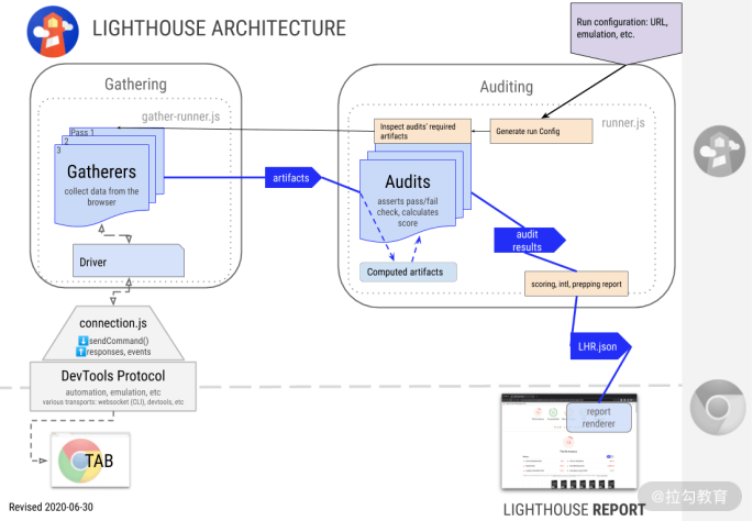 - 当网站页面开始加载之后,Lighthouse 会使用驱动(Driver)通过 Chrome DevTools Protocol 获取页面的性能数据;