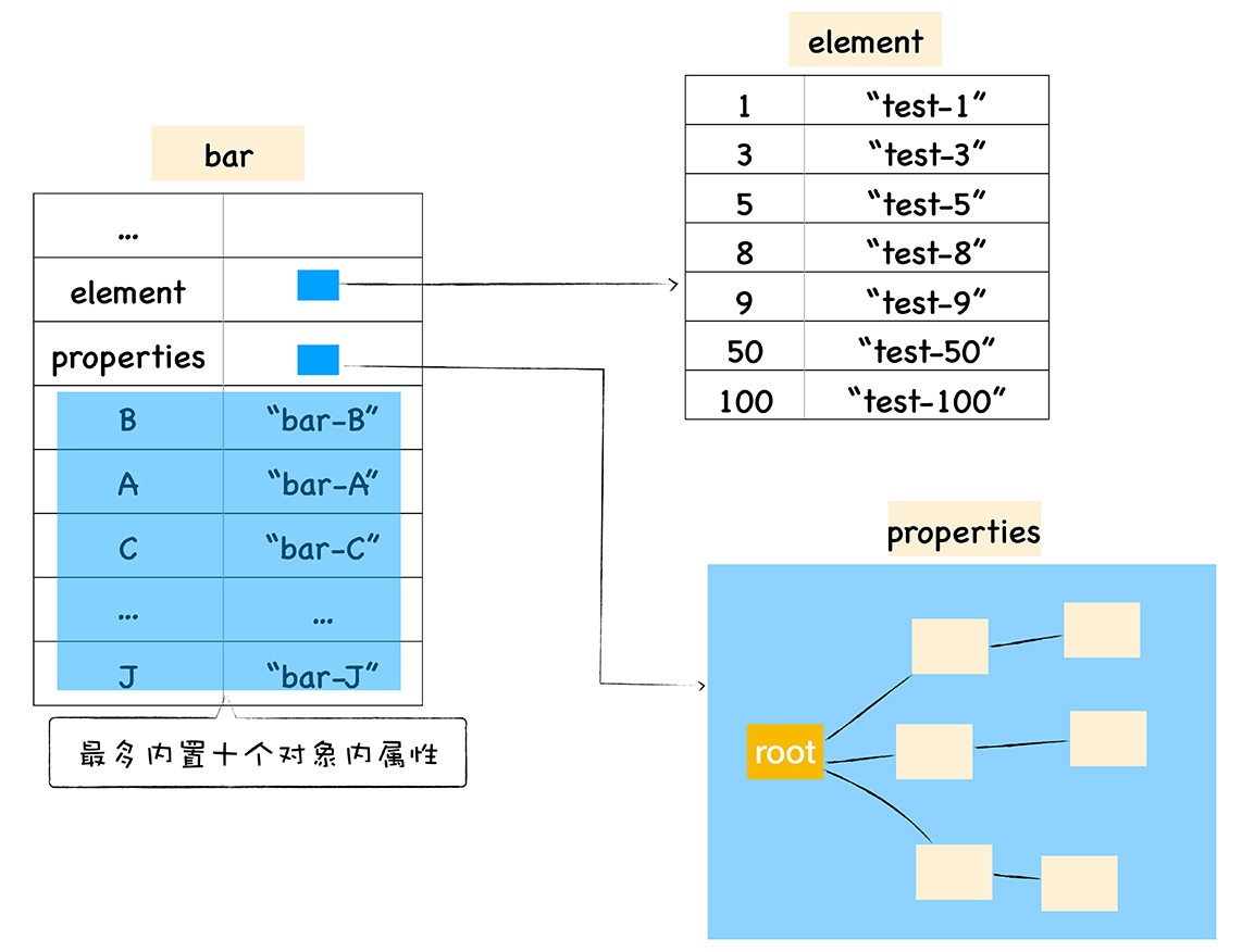 通常,我们将保存在线性数据结构中的属性称之为“快属性”,因为线性数据结构中只需要通过索引即可以访问到属性,虽然访问线性结构的速度快,但是如果从线性结构中添加或者删除大量的属性时,则执行效率会非常低,这主要因为会产生大量时间和内存开销。不过对象内属性的数量是固定的,默认是 10 个,